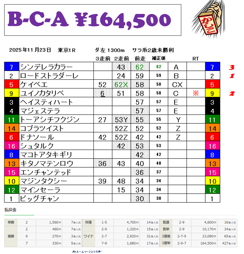 かしこい出馬表(’25 11/23東京01R・2歳未勝利) 2025.11.25 かしこい出馬表先週の結果 Post Views: 36 3連単164,500円 (B)7番人気-(C)3番人気-(A)5番人気 あんたはえらい! 11月22・23・24日のレース結果