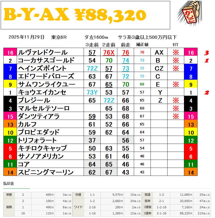 かしこい出馬表(’25 11/29東6R・3歳上1勝クラス) 2025.12.01 かしこい出馬表先週の結果 Post Views: 17 3連単88,320円 (B)3番人気-(Y)8番人気-(AX)1番人気 あんたはえらい! 11月29・30日のレース結果