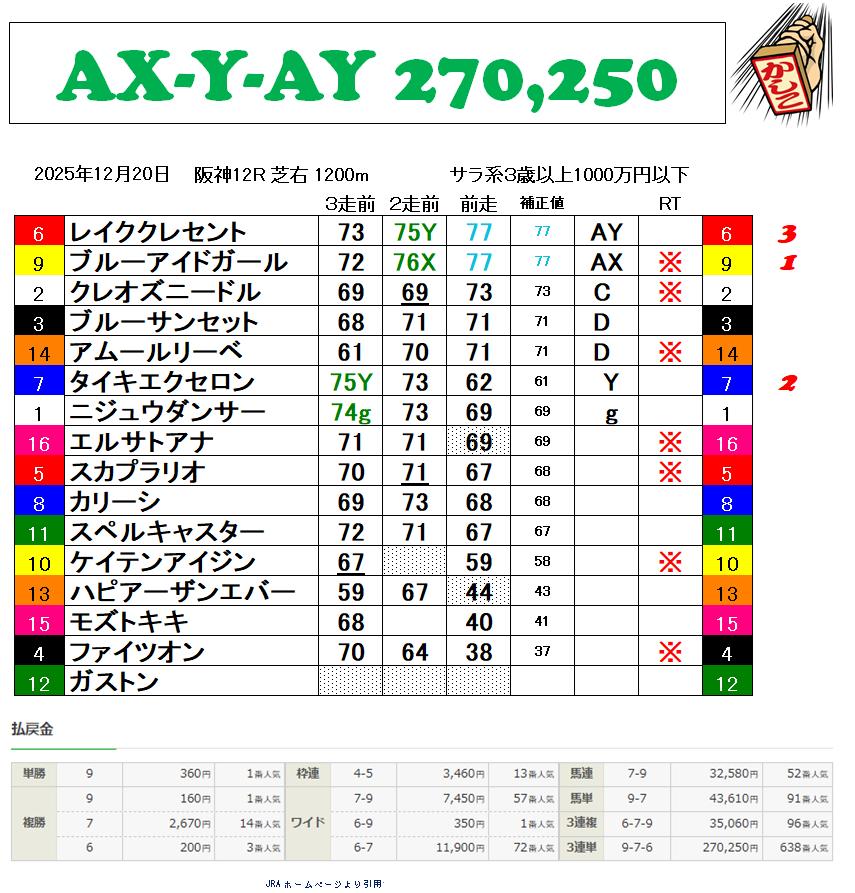 かしこい出馬表(’25 12/20阪神12R・3歳上2勝クラス) 2025.12.22 かしこい出馬表先週の結果 Post Views: 19 3連単270,250円 (AX)1番人気-(Y)15番人気-(AY)3番人気 あんたはえらい! 12月20・21日のレース結果