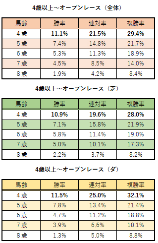 ちなみに、4歳以上のオープン(主に、年明け~6月のレース)も同様に調査したところ…