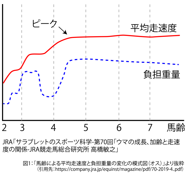 発見したのは「ウマの成長、加齢と走速度との関係」(JRA競走馬総合研究所・高橋敏之氏著)という記事。(クリックで該当記事へ飛べます)